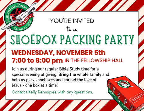 Place cash or a check in an envelope labeled “Operation Christmas Child” and drop it into one of the offering boxes in the sanctuary. You may also give online and designate your donation to the Operation Christmas Child fund.